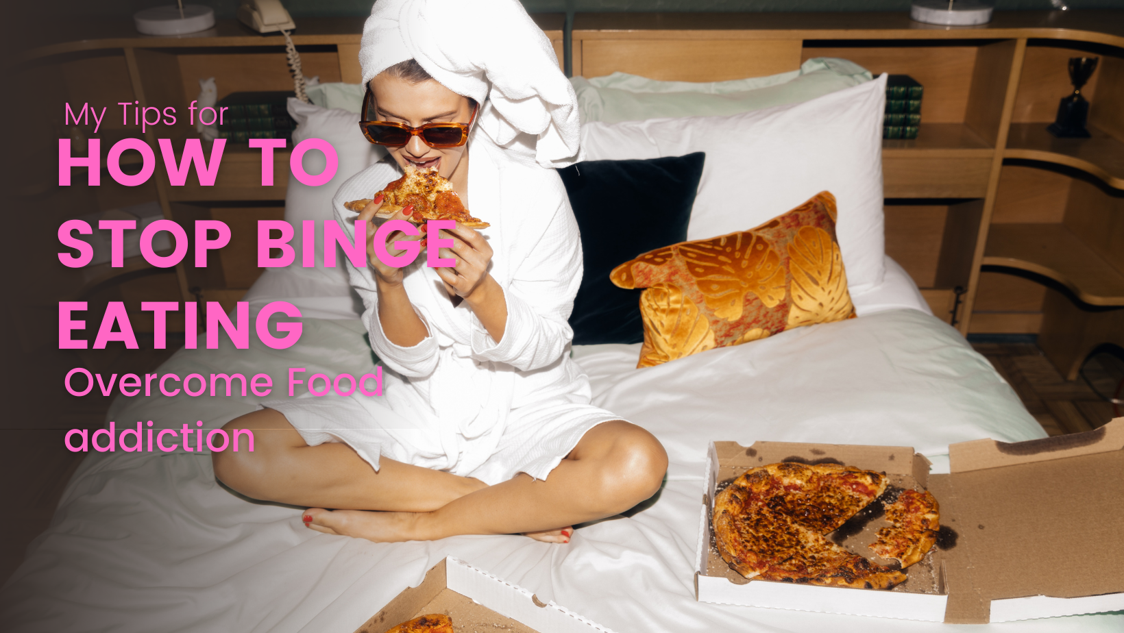 picture of woman binge eating pizza in white bathrobe on bed